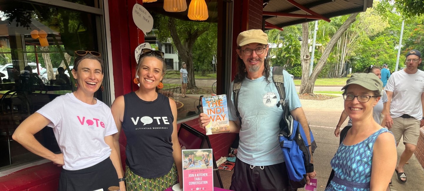 Voices of the Top End is a community group building local power through listening, learning, and collective action. Our work is grounded in respectful conversations that turn shared values into practical change for the Top End. VoTE is an incorporated association in the Northern Territory, see the Voices of the Top End constitution.